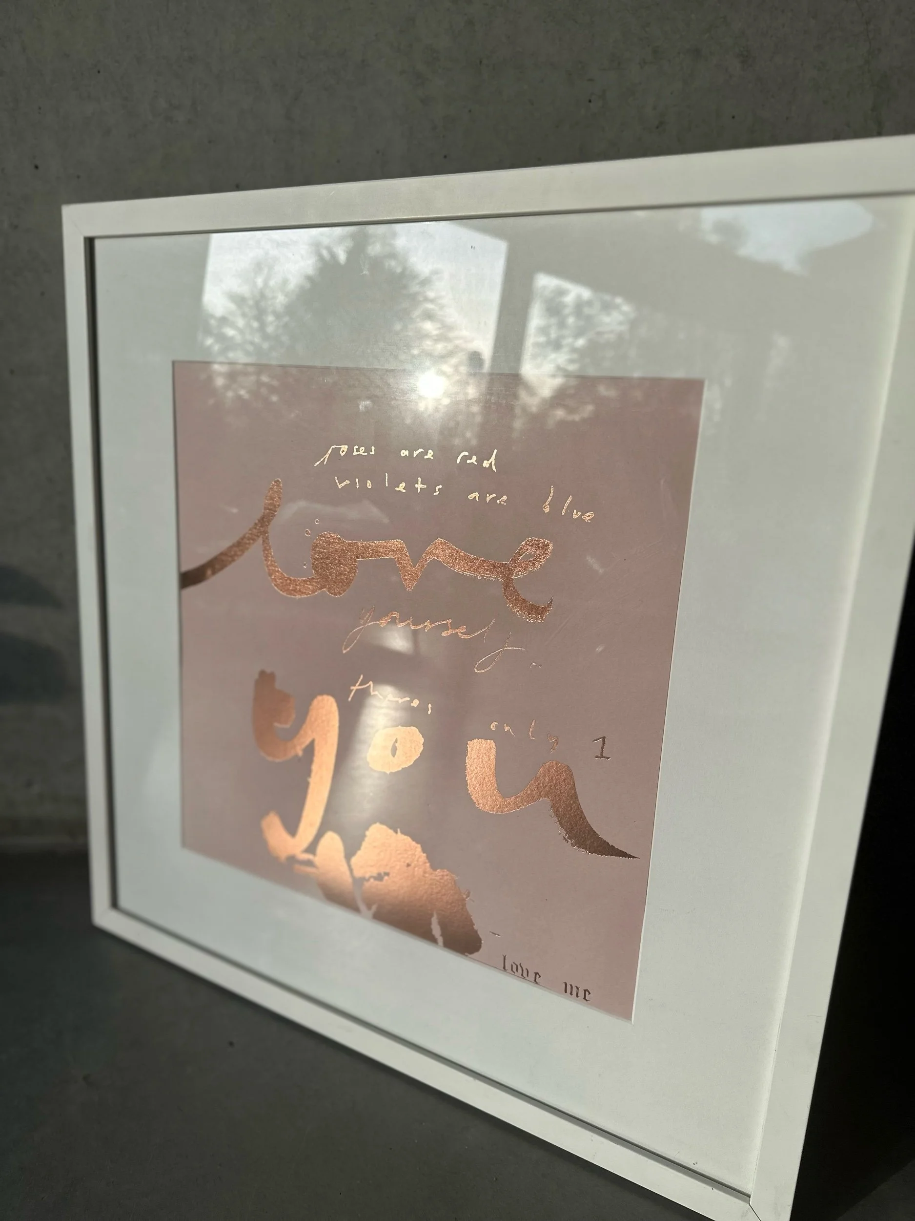 Image 1 of 5 Image 2 of 5 Image 3 of 5 Image 4 of 5 Image 5 of 5 Love You print gold foil £50.00 Only 1 available a beautiful quality print on pink paper with gold leaf foiling.unframed.35 x 35 cm Purchase Added! a beautiful quality print on pink paper with gold leaf foiling.unframed.35 x 35 cm